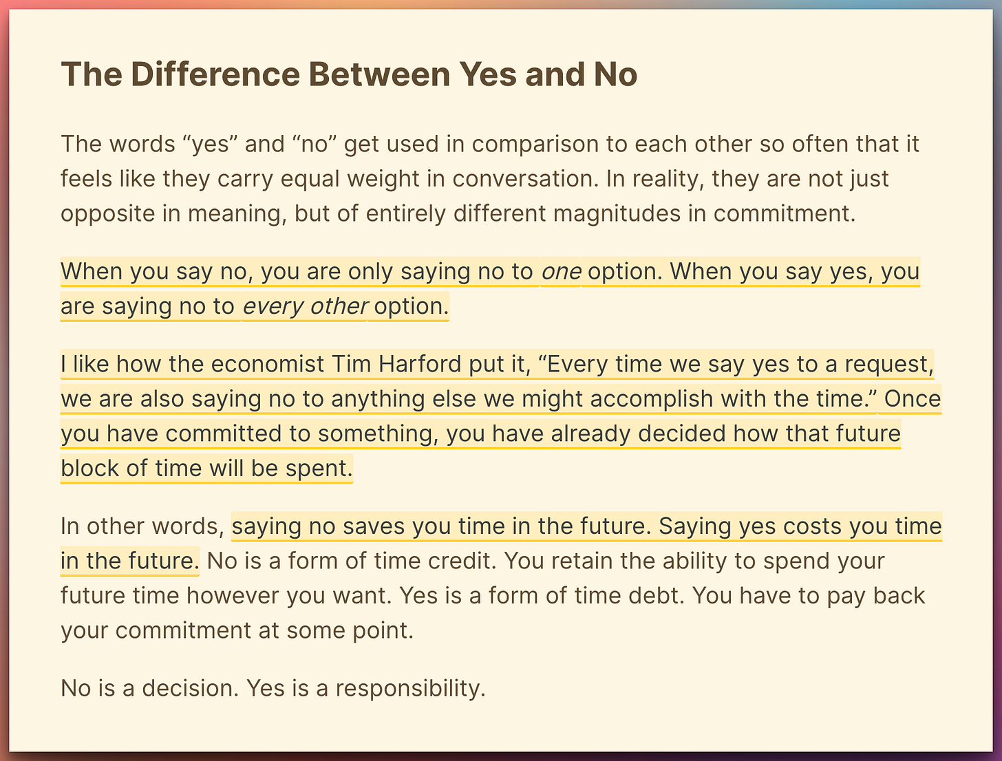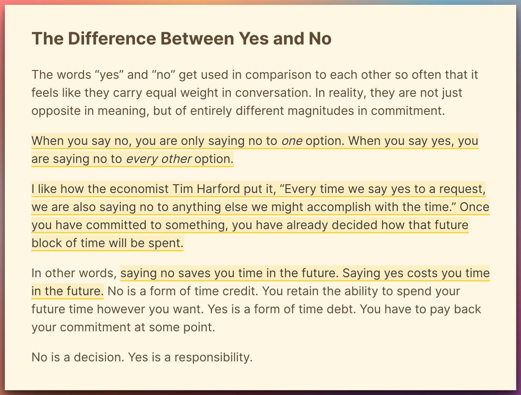 Saying no is an active choice, its about focus bringing focus in your life. Saying yes is about fragmenting your focus and letting yourself get distracted.